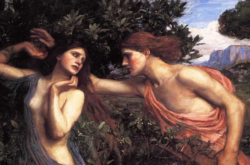 Daphne was the daughter of a river god named Peneus. She was perused relentlessly by Apollo who had been struck by one of Cupids arrows. Daphne, who had been struck by an arrow that repelled love, fled from the god until she prayed for safety and was finally transformed into the first laurel tree. The laurel oak wreaths that are so often associated with Apollo owe to this moment.